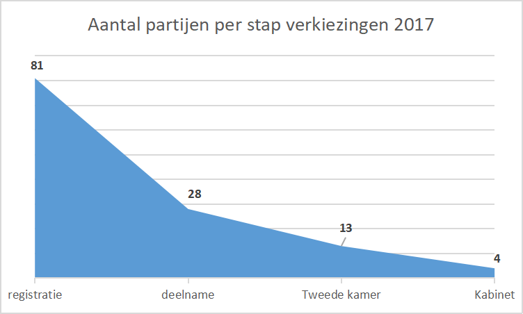 Kijken we hoeveel partijen de stappen de vorige verkiezingen (2017) haalden zien dat er toen 8 partijen minder een naam registreerden als nu: 81. Daarvan deden er 28 mee aan de verkiezingen en haalden 13 de kiesdrempel. Stap 1 is dit jaar dus iets voller, maar we zullen op 17 maart niet uit 50 partijen mogen kiezen.