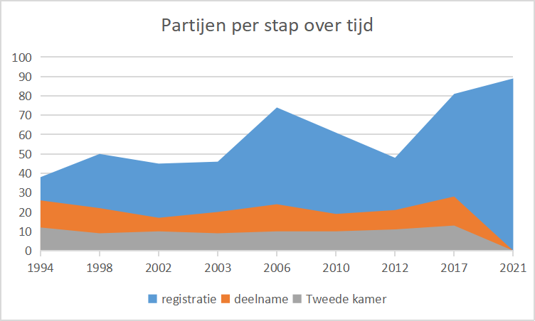 Hoe zit dat eigenlijk historisch? De afgelopen 27 jaar zijn er altijd een hoop partijen geweest die hun naar registreerden, al lijkt het over tijd nog iets toe te nemen. Dit betekent echter nauwelijks dat er ook meer partijen op het kiesbiljet staan (oranje, tussen 17 en 28), en nog minder dat er meer partijen in de Tweede Kamer gekozen worden - dat laatste is in die jaren altijd tussen 9 en 13 geweest. In 1994 stonden er 26 biljetten op het kiesbiljet en werden er 12 gekozen, in 2017 waren dit er 28 om 13. Voor 2021 is logischerwijs alleen de eerste stap nog maar bekend.
