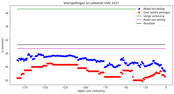De volgende grafiek laat det wee voorspellignen zien voor de grootste partij (VVD) tijdens de laatste verkiezing (15 maart 2017). Deze geeft de voorspellingen en referenties weer tegen de tijd: links is 6 maanden voor de verkiezing, rechts is de dag van de verkiezingen. De zwarte lijn is het resultaat dat de VVD uiteindelijk haalde (21,2%) en daar zouden de voorspellingen dus zo dicht mogelijk bij moeten liggen. De voorspelling exclusief peiling is in dit geval erg goed (paarse lijn, 20,7%), en zou een stuk betere voorspelling zijn dan als je gewoon het de laatste verkiezing als voorspelling had gebruikt (groene lijn, 26,6%). De rode punten zijn de toenmalige laatste peilingen, die bleken de volledige zes maanden voor de verkiezingen veel te pessimistisch voor de VVD. De blauwe punten zijn het model inclusief peilingen Dat had in dit geval een stukje beter gepresteerd dan puur kijken naar de peilingen: het vermoedde al dat de peilingen te laag waren, en was wat minder gevoelig voor schommelingen in de peilingen. Wel voorspelden de peilingen én het model de laatste week een slechtere uitslag van de VVD (dalende punten op het einde), terwijl de uiteindelijke uitslag juist hoger uit kwam. Opvallend genoeg was de voorspelling op 173 dagen voor de verkiezingen het allerbeste - dat is toeval in dit ene geval en zegt niet dat we die zouden moeten gebruiken.
