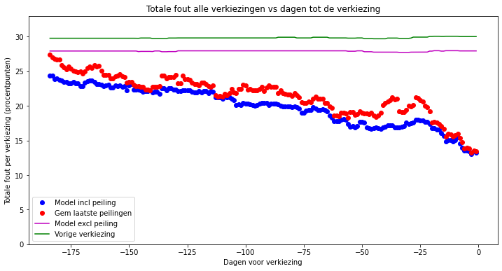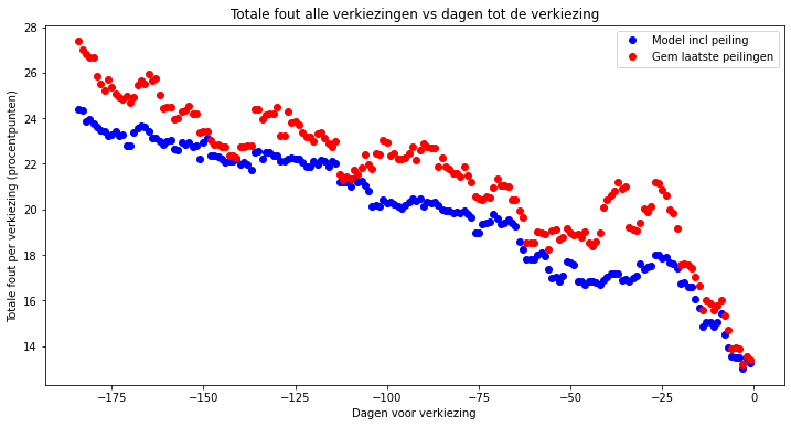 Dit is duidelijker te zien als we verticaal inzoomen: de blauwe stippen van het model liggen consistenter en lager dan de rode stippen van de peilingen. De fout van het model is gemiddeld 7,1% en maximaal 19% (rond 35 dagen voor de verkiezingen) kleiner dan de laatste peiling.