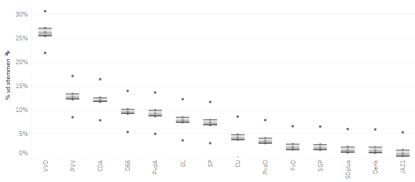 Als ik verder kijk valt dat op de voorspelling voor de VVD voorspeld wat lager is dan de peilingen suggereren en de PvdA iets hoger voorspeld wordt. Een reden bij beide is dat er dus ook gekeken wordt naar de uitslagen van de laatste verkiezingen en die suggeren een grotere PvdA en een kleinere VVD dan de peilingen. Of dat in maart ook daadwerkelijk zo is zal de tijd uitwijzen.