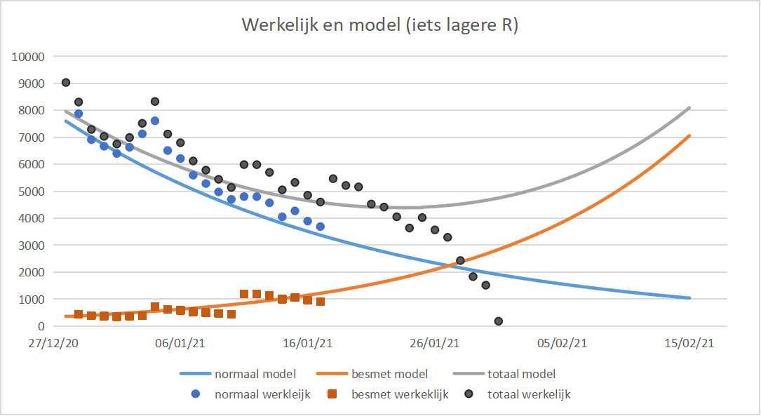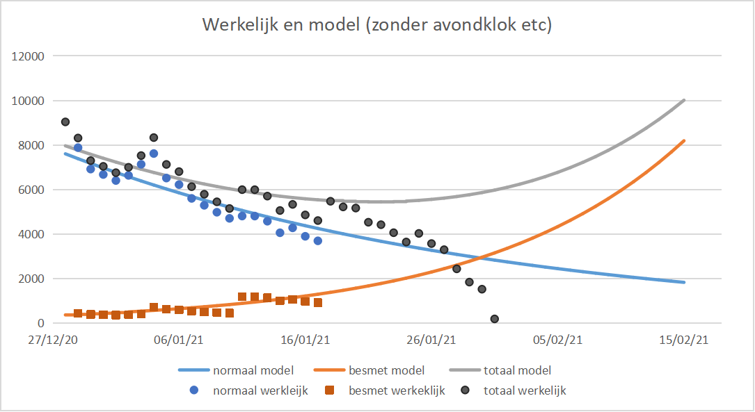 Laten we eerst kijken naar de Corona situatie. De avondklok is nu een week van kracht, maar zoals overal al geschreven zouden we dus pas vanaf dit weekend effect moeten zien. We kunnen dus de situatie van voor de avondklok nader bekijken - vorige week leek het niet de goede kant op te gaan. Helaas zijn er geen cijfers gepubliceerd over de besmettelijkere (Britse) variant, wel meer cijfers over alle varianten bij elkaar. Net zoals vorige week hier gepubliceerd naar eerste ziekte dag (niet naar publicatiedag) en daarom zie je een snelle daling op het einde - daar missen nog gevallen waar over gerapporteerd wordt. Toch lijkt de daling wel iets sneller te gaan dan mijn simpele mode voorspelde. Dat is goed nieuws en dus ruimte voor enig optimisme: mogelijk zouden we met de maatregelen van voor de avondklok dus ook de Britse variant kunnen hebben. Wel veel onzekerheid op basis van deze cijfers.Update: uiteraard wordt een paar uur nadat ik dit geschreven heb nieuwe cijfers over de besmettelijkere variant en de geschatte R gepubliceerd door het RIVM via het OMT advies: deze variant was in week 2 19.8% van alle besmettingen - da's erg veel. Wel schat het RIVM het verspreidingsgetal (de R) van de overige varianten wat lager (0,85 ipv 0,9), wat klopt met mijn inschatting net ervoor dat er nu een iets sterkere daling is dan je anders zou verwachten. Zie links de geupdate grafiek met de extra cijfers, rechts een grafiek met die iets lagere verpsreidingsgetal voor de andere varianten. Het verschil is klein, en de conclusie wordt er nauwelijks beter van.