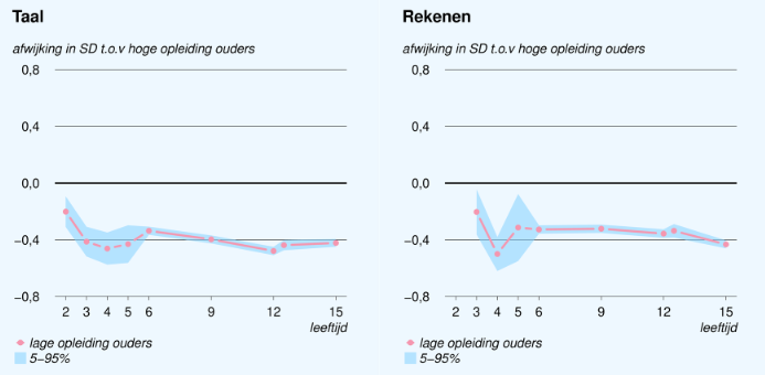 Hoe groot was het verschil tussen de leerprestaties eigenlijk? Het Centraal Plan Bureau (CPB) heeft dit onderzocht en dat leverde onder andere onderstaande grafieken op. Hier op is te zien dat de leerprestaties van kinderen met lager onderwijs gemiddeld -0.4 standaard deviatie lager zijn dan van hoge opleiding. Dit betekent dat 2/3 van alle kinderen van ouders met lager onderwijs onder het gemiddelde van kinderen met ouders met hoger onderwijs zitten. Persoonlijk vind ik best fors.